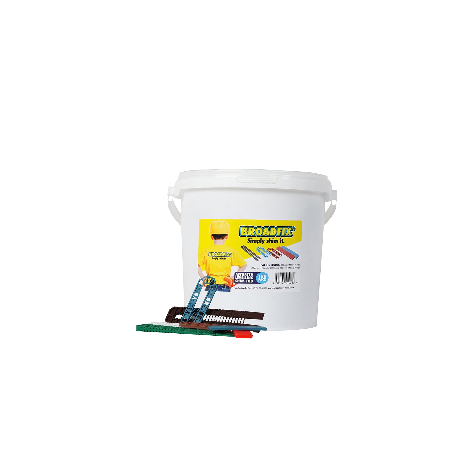 This mixed tub of 150 Broadfix Assorted Levelling Shims contains 45 standard U shims (101mm x 43mm), 90 flat shims (100mm x 28mm) and 15 double snap wedge shims (200mm x 42mm).