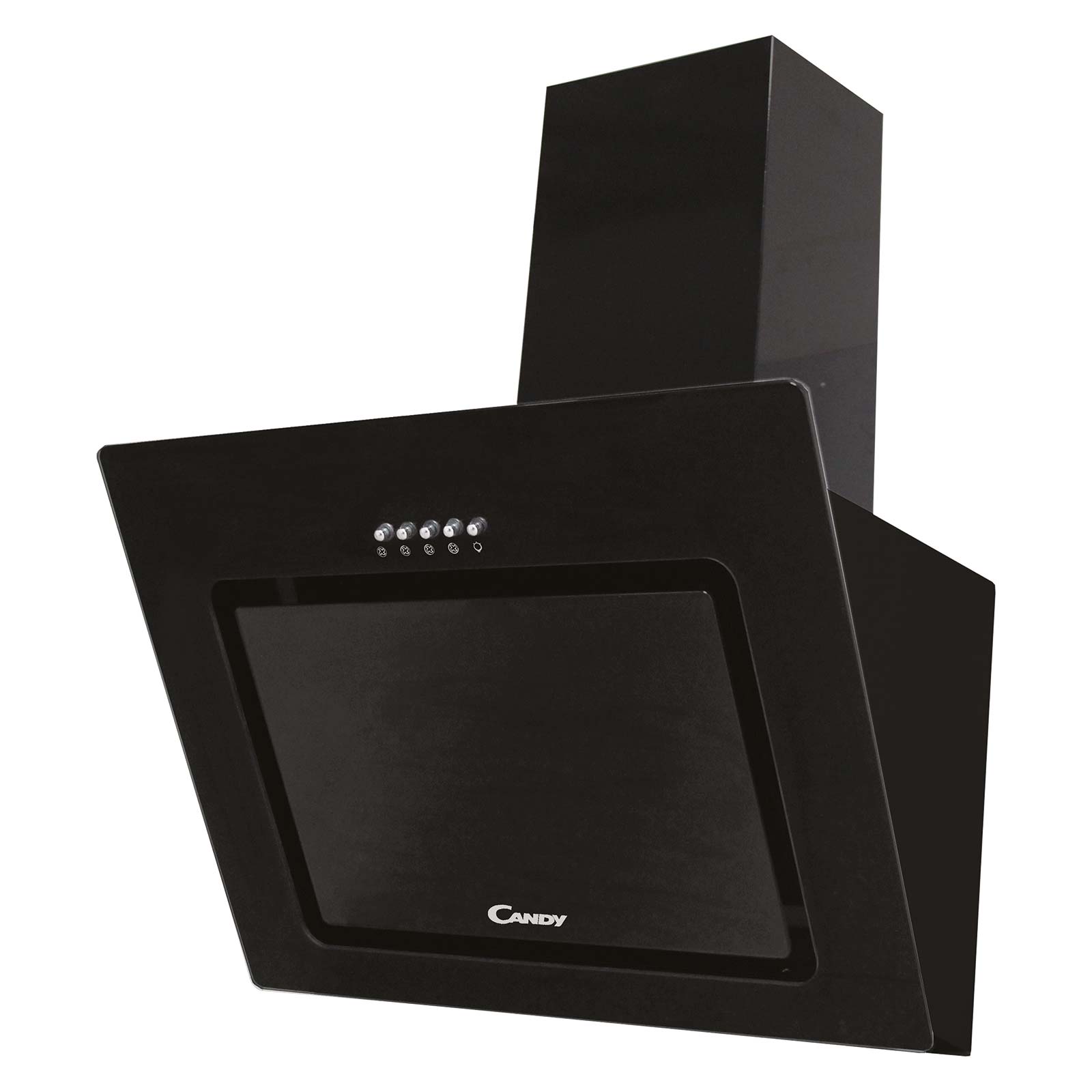 A Candy 60cm Black Angled Cooker Hood for efficiently clearing cooking odours. This wall-mounted black extractor hood has three different speeds for setting the air flow, an LED light for illuminating the cooking area and an aluminium filter. The Candy black glass cooker hood has an extraction rate of 463m³/hour.
