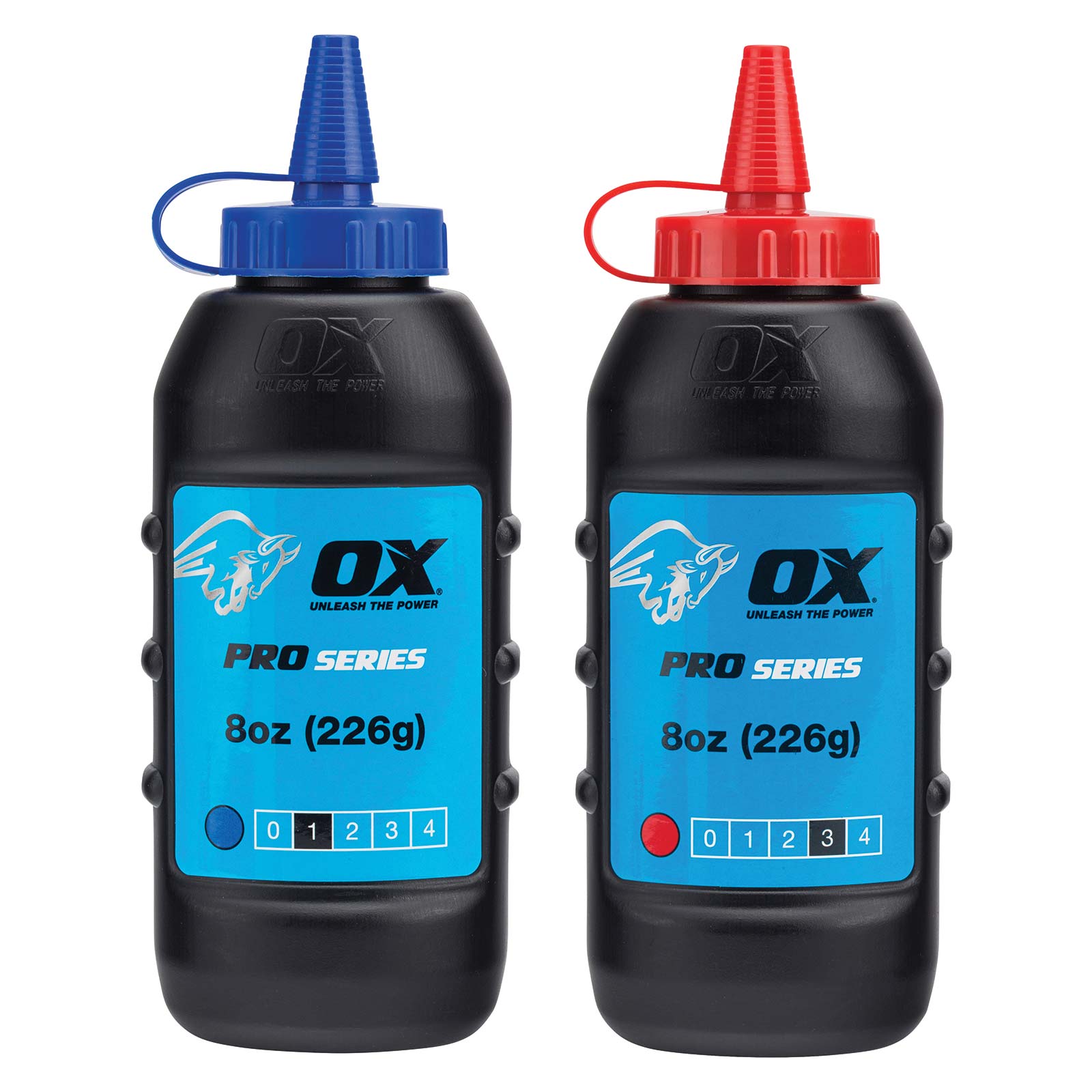 OX Pro Red Chalk Powder, contained in a refillable easy-pour container, is formulated for good adhesion and high visibility and can be used for both interior and exterior use.