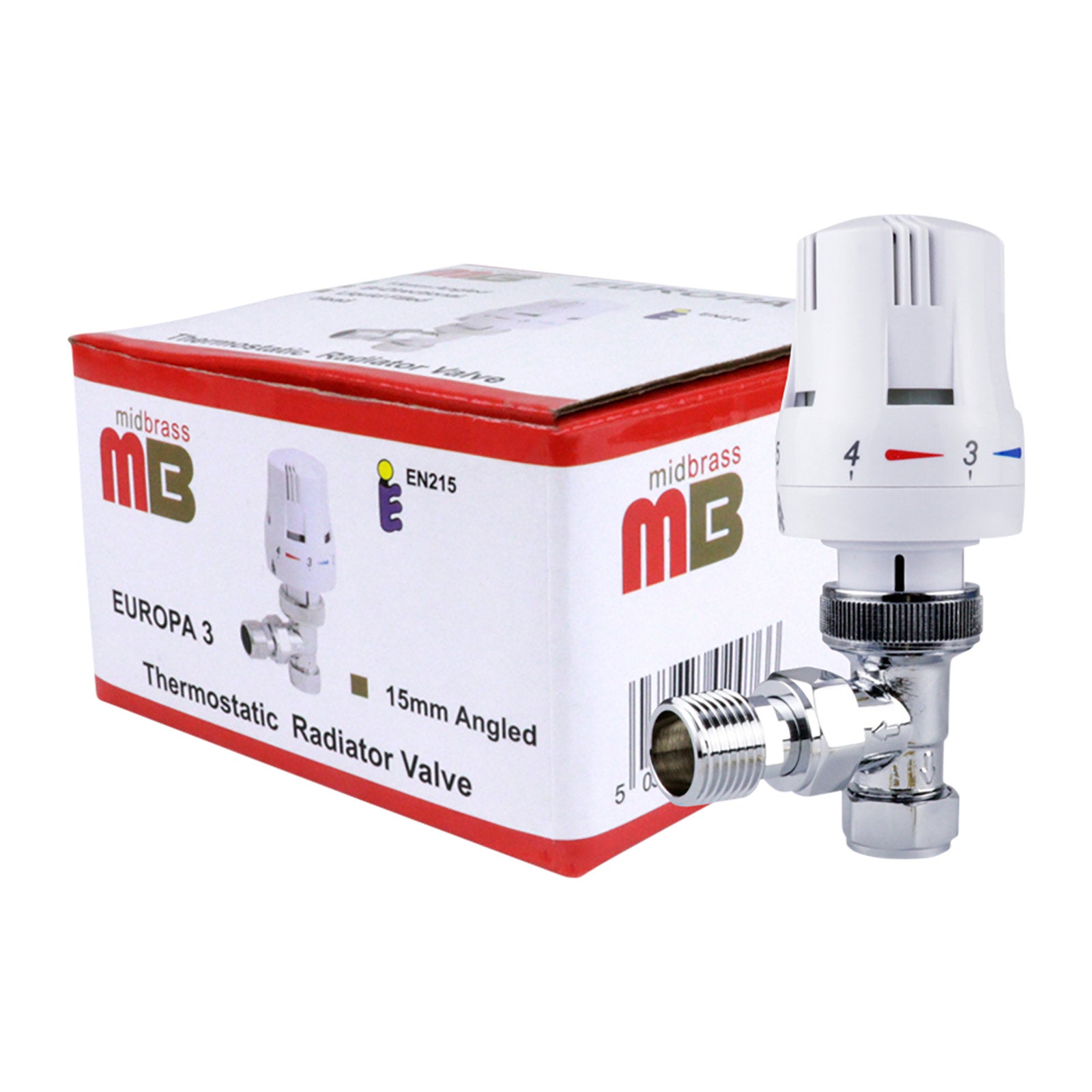 A Chrome & White 15mm Europa 3 Angled Thermostatic Radiator Valve (TRV) ideal for hot water systems in homes, offices and commercial buildings. This angled TRV features a bi-directional flow for heating both single and double panel radiators effectively. It has a liquid-filled head for precise temperature regulation and a frost protection function to safeguard against freezing. This reliable 15mm thermostatic radiator valve has a maximum working pressure of 10 bar, maximum flow temperature of 120°C and a maximum differential pressure of 1 bar. It also comes with a 15mm x 10mm compression reducing set.