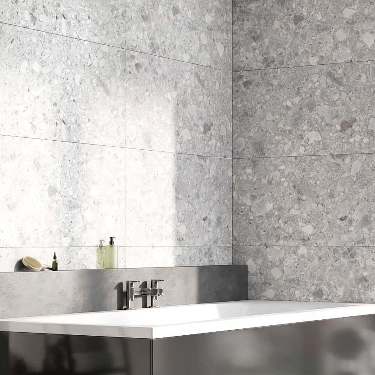 The Denver Perla Tiles impressively mimick the lavish look of stone. They feature a terrazzo pattern formation with a slick matt finish that adds a natural look and feel to any room across the walls and floors. The Denver Tiles are made from hard-wearing porcelain in a matt finish.