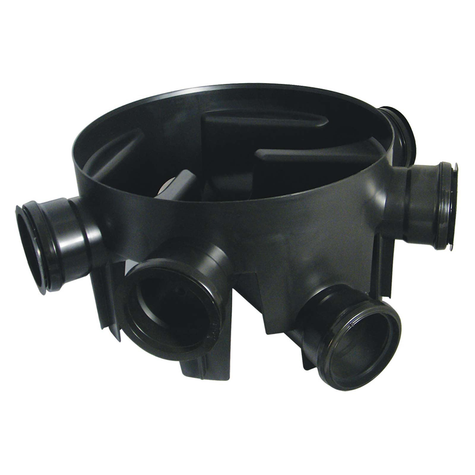 The FloPlast 450mm Black Chamber Base with 5 Fixed Inlets forms an inspection chamber for use at a point of connection and has 5 fixed inlets for connecting pipes. Supplied with 2 socket plugs.