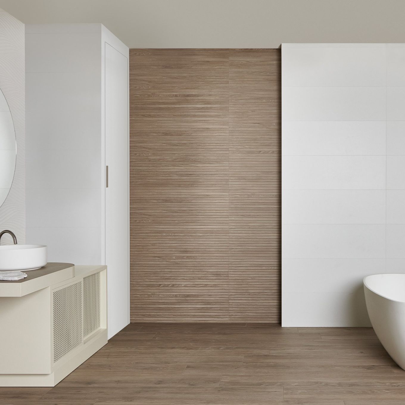 These wood like tiles can be applied to the walls only and have rectified edges, reducing grout lines for a more cohesive finish.