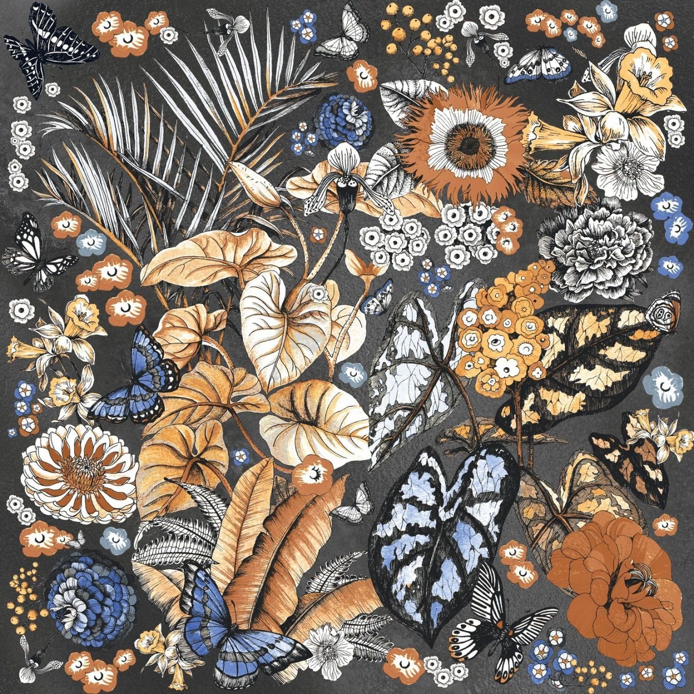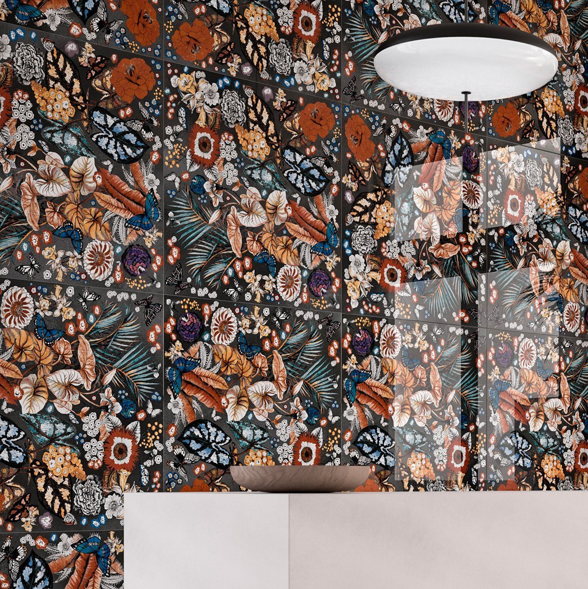 The Saigon Black Décor Porcelain tile is sure to add character to the room with its bold design and array of bold and warm tones giving a vibrant vintage vibe. This large tile features a combination of organic motifs coming together to create a chic meadow with a contrasting black background.